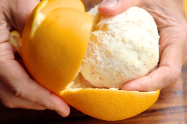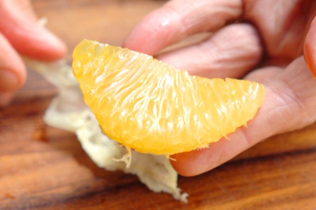 まずは、はっさくの皮(外皮)に包丁で切り目を入れてから、指で皮をむきます。