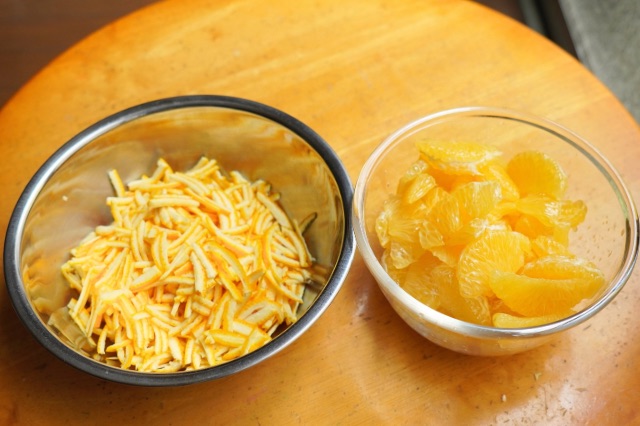はっさく3個分の千切りした外皮と、むいた実です。