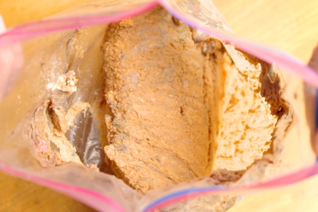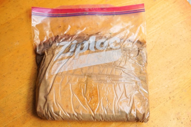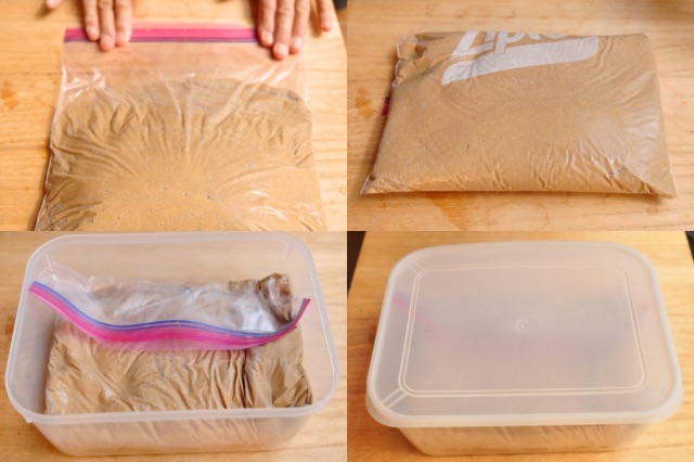 保存袋にぬかと塩サバを交互に入れ、サバが完全にぬかの中に隠れるようにします。