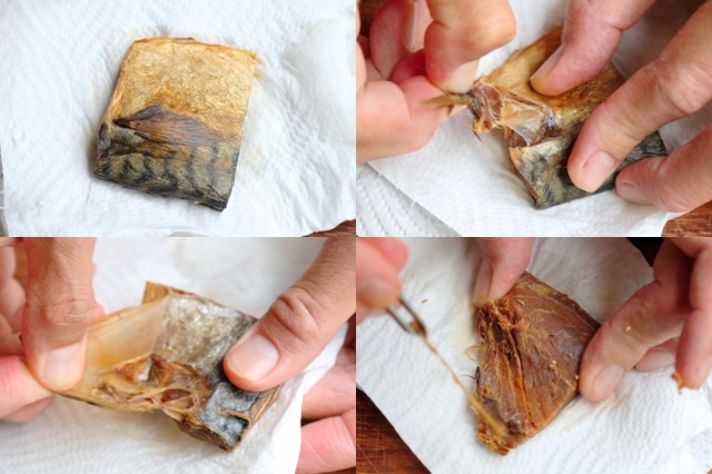 胸ビレを取り除き、皮を剥ぎ、骨を抜きます。