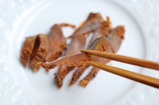 普通の焼き魚のように箸で身を割って食べようにも、水分が抜けてるために硬くて箸が入りにくいです。