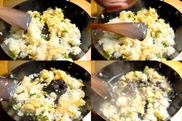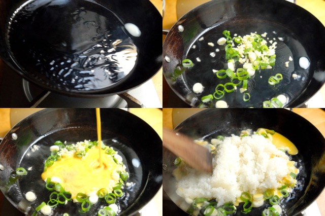 フライパンを熱し、ラードを溶かし、薬味、卵、ご飯を入れ混ぜます。