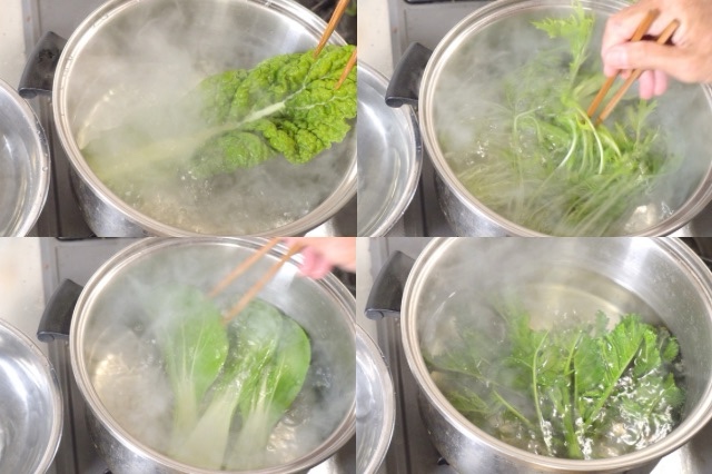 茹で方は、それぞれの菜っ葉に最適と思われる方法で茹でました。