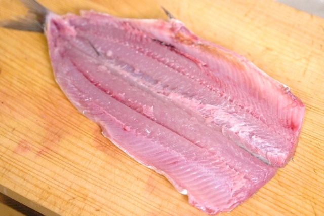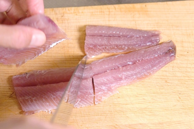 包丁で半分に切り、尻尾を切り落とし、背びれの骨を切り取り、腹びれも切り取ります。