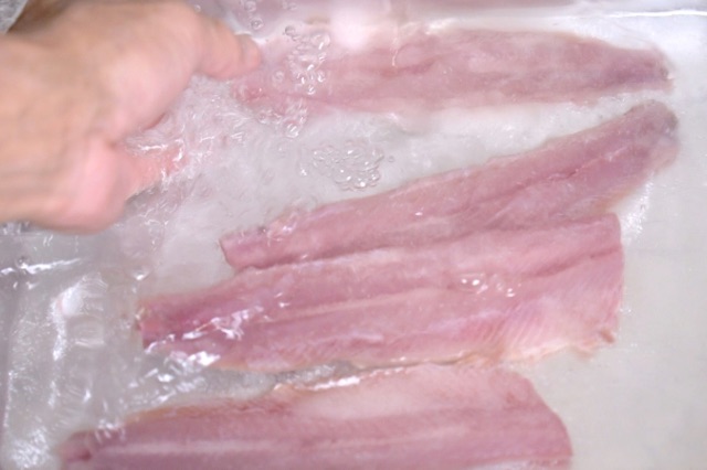 じゃあ、次はラップだけで包んだ方の、ご飯は食べずにお魚だけいただきます。