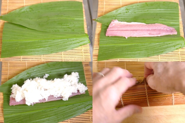 まきすの上に葉蘭、イワシ、塩ご飯を置き、巻きます。