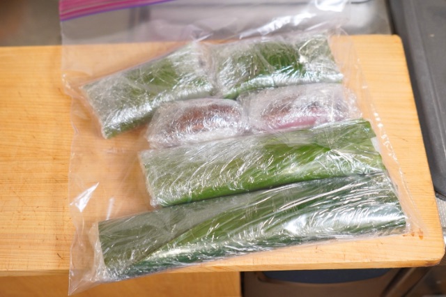 葉っぱで包むのは、葉っぱに付いてる植物性乳酸菌が、発酵スターターになって乳酸発酵を始めてくれるのを期待しての事です。