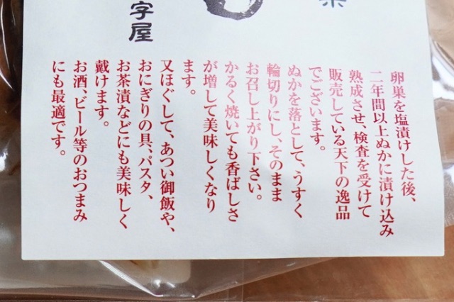 卵巣を塩漬けした後、二年間以上ぬかに漬け込み熟成させ、検査を受けて販売している天下の逸品でございます。