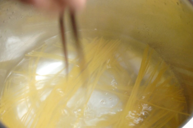2.鍋に湯を沸かし、塩を加えてスパゲッティを茹で始めます。