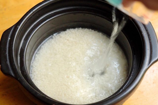 という事で、土鍋にお米と重曹水溶液を入れてしばらく置いてお米に水分を吸わせます。