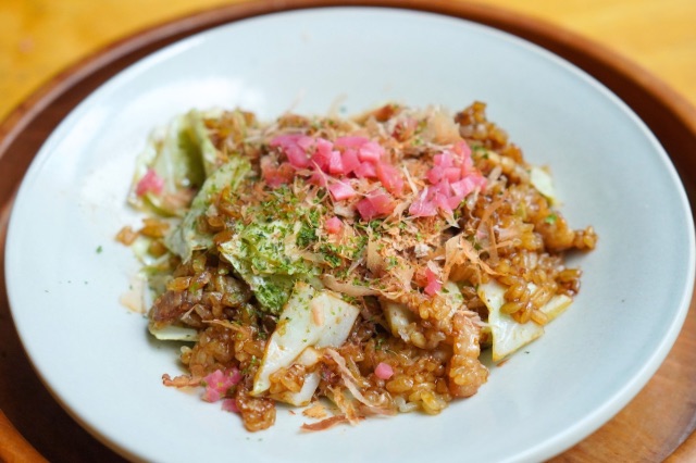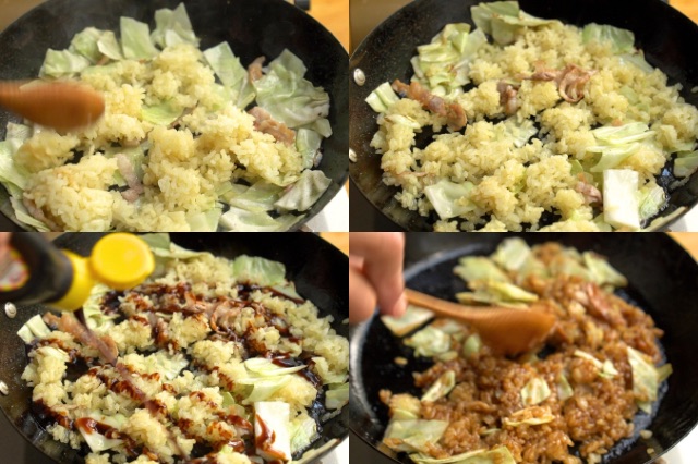 ラーメン化ご飯を入れ混ぜ、焼きそばソースを入れ混ぜます。