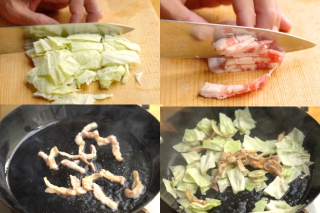フライパンを温め、ラードを溶かし、豚バラ肉とキャベツを炒めて塩・コショウを振っておきます。