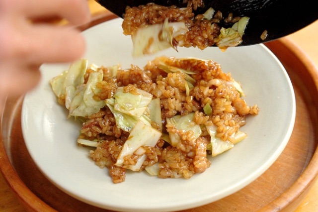 豚挽き肉・キャベツ・ねぎを炒めて、卵を入れ、ラーメン化ご飯を入れ、塩・コショウ・醤油で味付けしました。