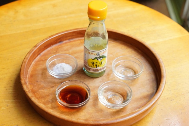 3種の塩ポン酢を作り、最後に市販の塩ポン酢も交えて試飲してみます。