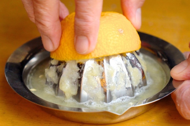さらにスプーンで果肉を押さえて、しっかりと果汁を取ります。
